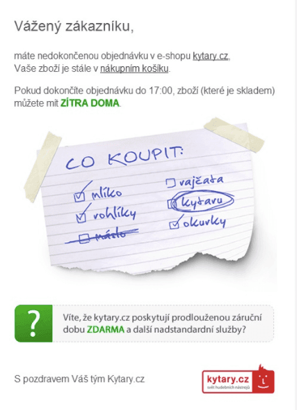 Když už si člověk dá do košíku nějaké produkty, tak už o ně má dost pravděpodobně veliký zájem. Připomeňte mu, že si u vás něco zapomněl nebo se ho zeptejte, zda nechce dokončit objednávku. Můžete mu také nabídnout slevový kupón, a ještě více ho tak motivovat.